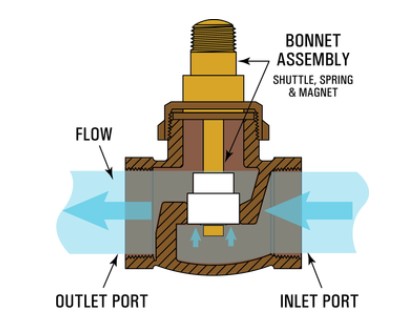 當(dāng)流量達(dá)到開關(guān)的設(shè)定點時,磁梭克服了復(fù)位彈簧的向下力,并致動閥蓋閥桿內(nèi)的密封SPDT簧片開關(guān)元件。