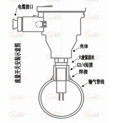 在所用管線上選取一直管段,直線管段長度amp;ge;5(D為直管段直徑)在直管段中部開一30孔,把附帶的短接焊在孔上,然后把流量開關(guān)旋在短接上(在管壁上套與流量開關(guān)配套的管紋連接。