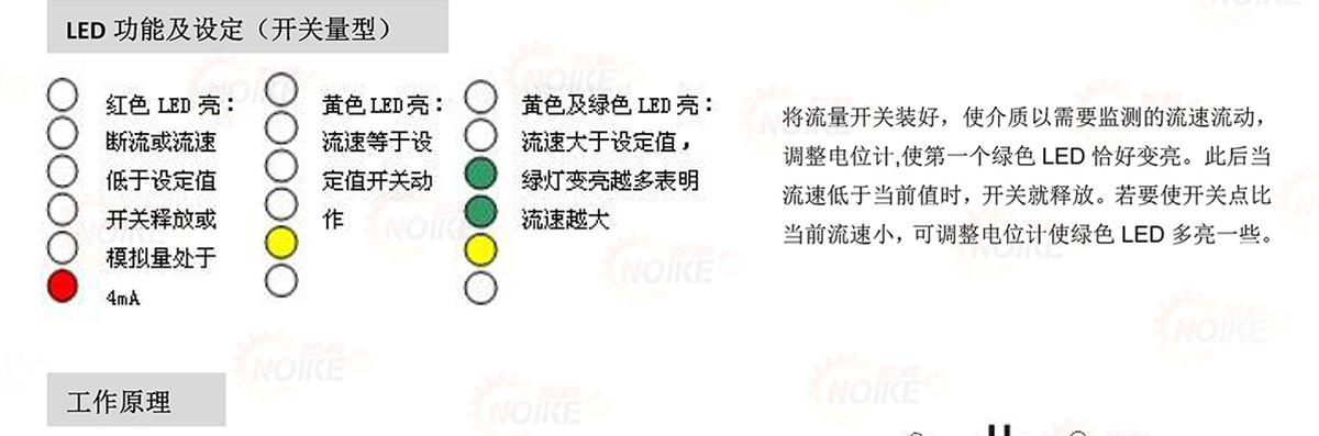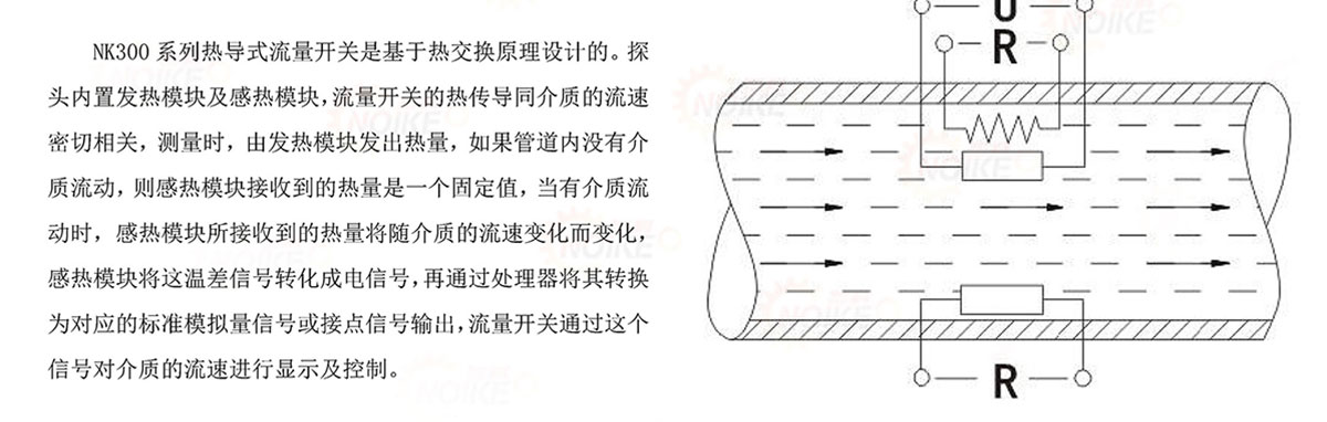 NK300系列熱導(dǎo)式流量開關(guān)可對(duì)管道中的液體流動(dòng)情況進(jìn)行實(shí)時(shí)監(jiān)控,無活動(dòng)部件,免維護(hù),安裝方便,一種型號(hào)是用于多種管徑要求,提供開關(guān)量輸出,并采用6個(gè)LED實(shí)時(shí)顯示流體流速狀態(tài),實(shí)現(xiàn)下列監(jiān)控功能:介質(zhì)流動(dòng),降低/提高流速:介質(zhì)存在/不存在:介質(zhì)流動(dòng)/靜止;監(jiān)控管道內(nèi)流體流速大小、斷流監(jiān)測(cè)或防止泵的空轉(zhuǎn)。被廣泛應(yīng)用于石油化工、電力、治金、鋼廠、造紙、食口品加工、水處理、電池廠等行業(yè)。氣液兩用型,可用于氣動(dòng)和液壓系統(tǒng),可用于循環(huán)水,切割液及潤(rùn)滑油的斷流監(jiān)測(cè),以及泵的空轉(zhuǎn)保護(hù)。