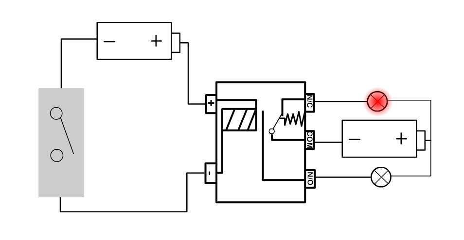 這個(gè)交互式動(dòng)畫向您展示了一個(gè)非常簡單的場景,其中使用了N / O和N / C,根據(jù)是否有通過繼電器的電源,打開紅色或綠色光源。